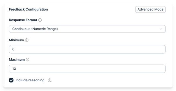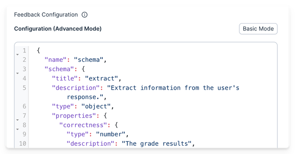You can configure output types (binary, multiclass), include reasoning to improve prediction quality, or provide a raw JSON schema with any structure you define. Use these custom schemas in your evaluations to capture exactly the feedback you need.