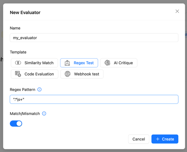 - Reusable Evaluators: Configure evaluators such as similarity match, regex match, or AI critique and use them across multiple evaluations.