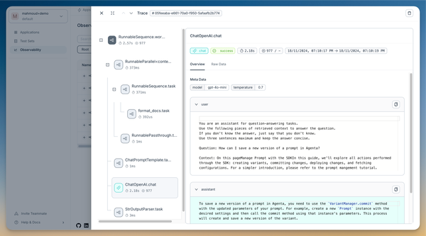 We'll build a simple Q&A RAG application that answers questions about Agenta's documentation. Then, we'll instrument the calls (i.e., trace them) and view the trace in Agenta.